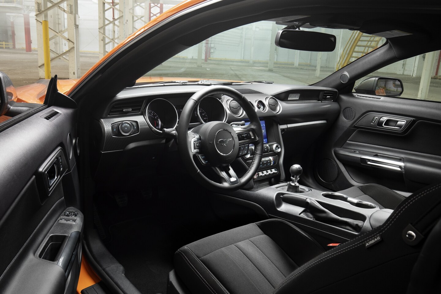 The Mustang comes with a variety of convenient features, including active noise cancellation, an auto-dimming rearview mirror, push-button start, and cruise and audio controls on a leather-wrapped steering wheel. You'll also get a six-speaker sound system, a Wi-Fi hot spot, and folding rear seats.