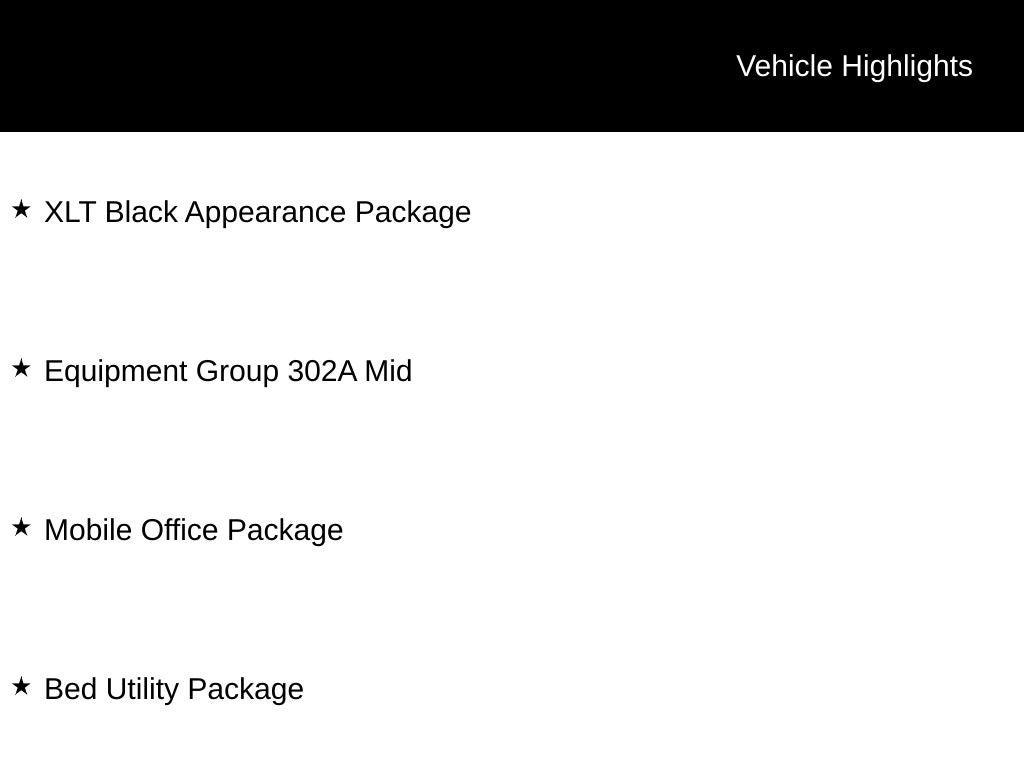 360 Degree Camera, 4 Pickup Box Tie-Down Plates, 400W Cab & Bed Outlets, 6 Angular Bright Anodized Step Bar, 6 Black Running Boards, Adaptive Cruise Control w/Stop & Go, Auto-Dimming Rear-View Mirror, Bed Utility Package, Black Exterior Badging, Black Grille, Black Painted Grille w/Chrome Center Bar, Body-Color Front & Rear Bumpers, Chrome Door & Tailgate Handles, Chrome Single-Tip Exhaust, Cloth 40/Console/40 Front Seats, Connected Navigation, Console Worksurface, Dark Interior Appliques, Driver State Detection, Dual-Zone Electronic Automatic Temperature Control, Equipment Group 302A Mid, Evasive Steering Assist, Floor Shifter, Ford Co-Pilot360 Assist 2.0, Front Parking Sensors, Gray Box Side Decal, Heated Front Seats, Intelligent Access w/Push Button Start, LED Box Lighting, Mobile Office Package, Partitioned Lockable Rear Storage, Power Glass Heated Sideview Mirrors, Power-Sliding Rear Window, Remote Start System w/Remote Tailgate Release, Tailgate Step w/Tailgate Work Surface, Towing Technology, Unique Sport Cloth 40/Console/40 Front-Seats, Wheels: 18 Gloss Black, Wrapped Steering Wheel, XLT Black Appearance Package.